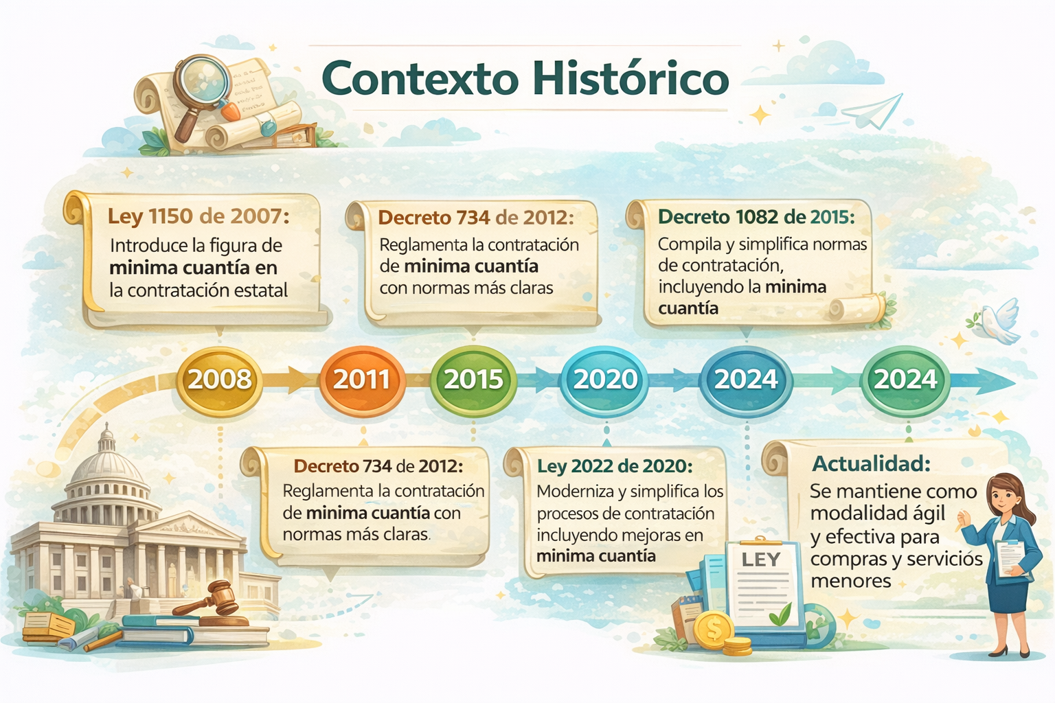 Este módulo está diseñado para consolidar tu conocimiento empírico en una comprensión sólida y conceptual de la modalidad de contratación por Mínima Cuantía. No es solo «qué hacer», sino «por qué, cuándo y cómo». A continuación, se detallan sus fundamentos, historia y funcionamiento operativo.